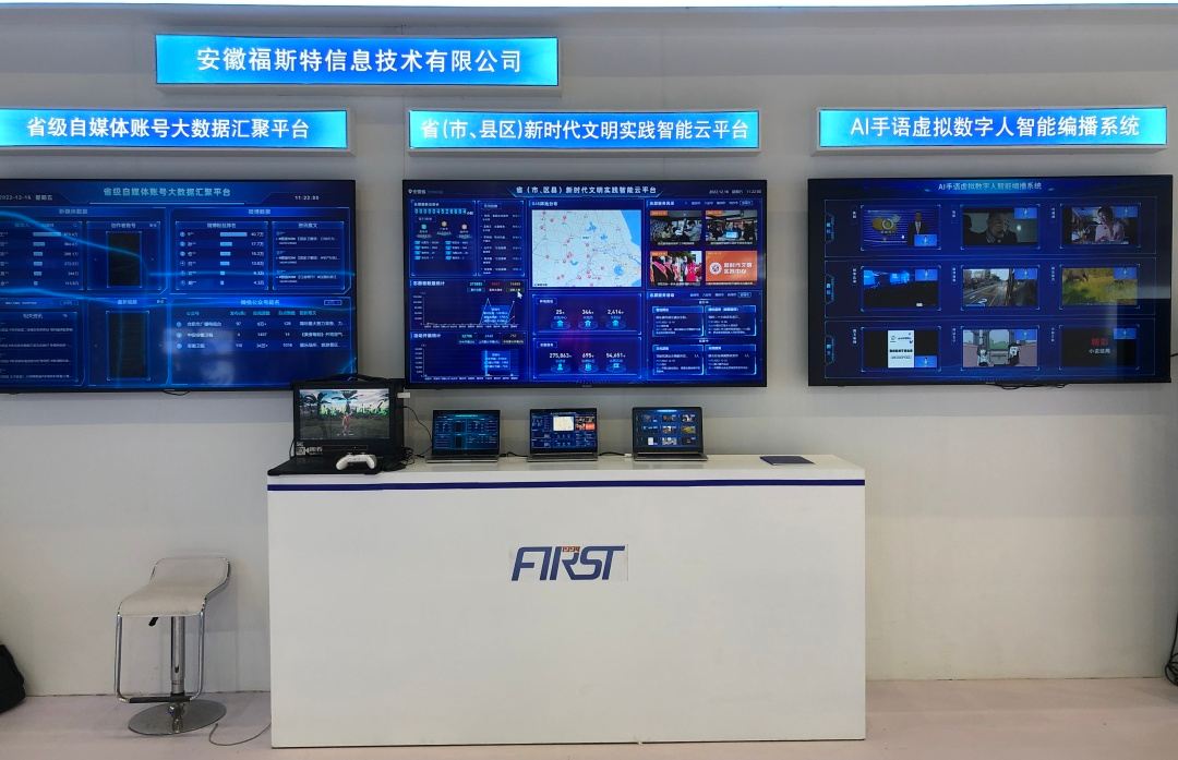 安徽福斯特信息技術有限公司此次應邀參展,以廣電媒體發(fā)展為亮點,集中展示大數(shù)據(jù)、人工智能呈現(xiàn)了AI-VLOG視頻智能合成系統(tǒng)+AI手語虛擬數(shù)字人智能編播系統(tǒng)+省級自媒體賬號大數(shù)據(jù)匯聚平臺+省(市、縣區(qū))新時代文明實踐智能云平臺技術。